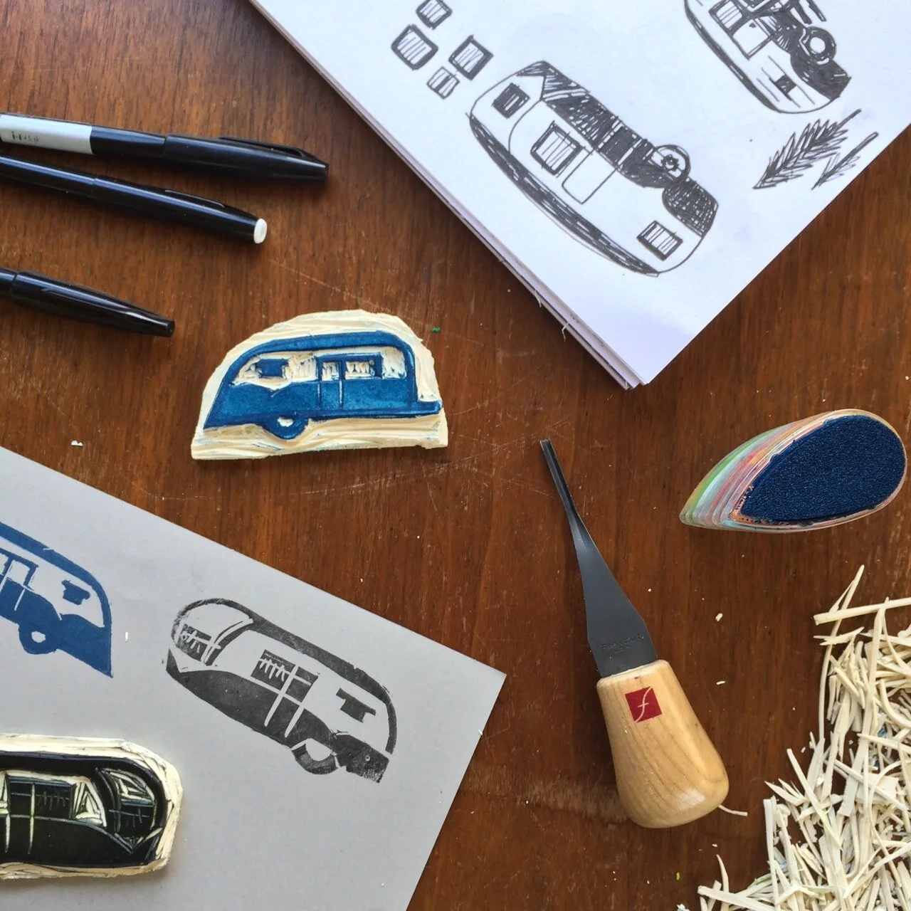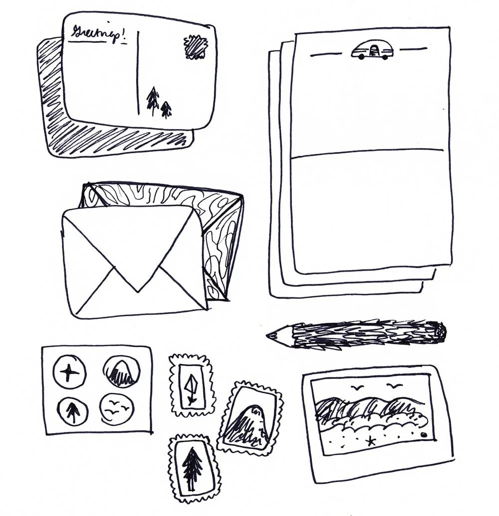 The letter sets will include a mix & match variety of post cards, writing sheets, envelopes and ephemera, embellished with hand carved stamps, drawings, and imagery that celebrates the Northwest experience"