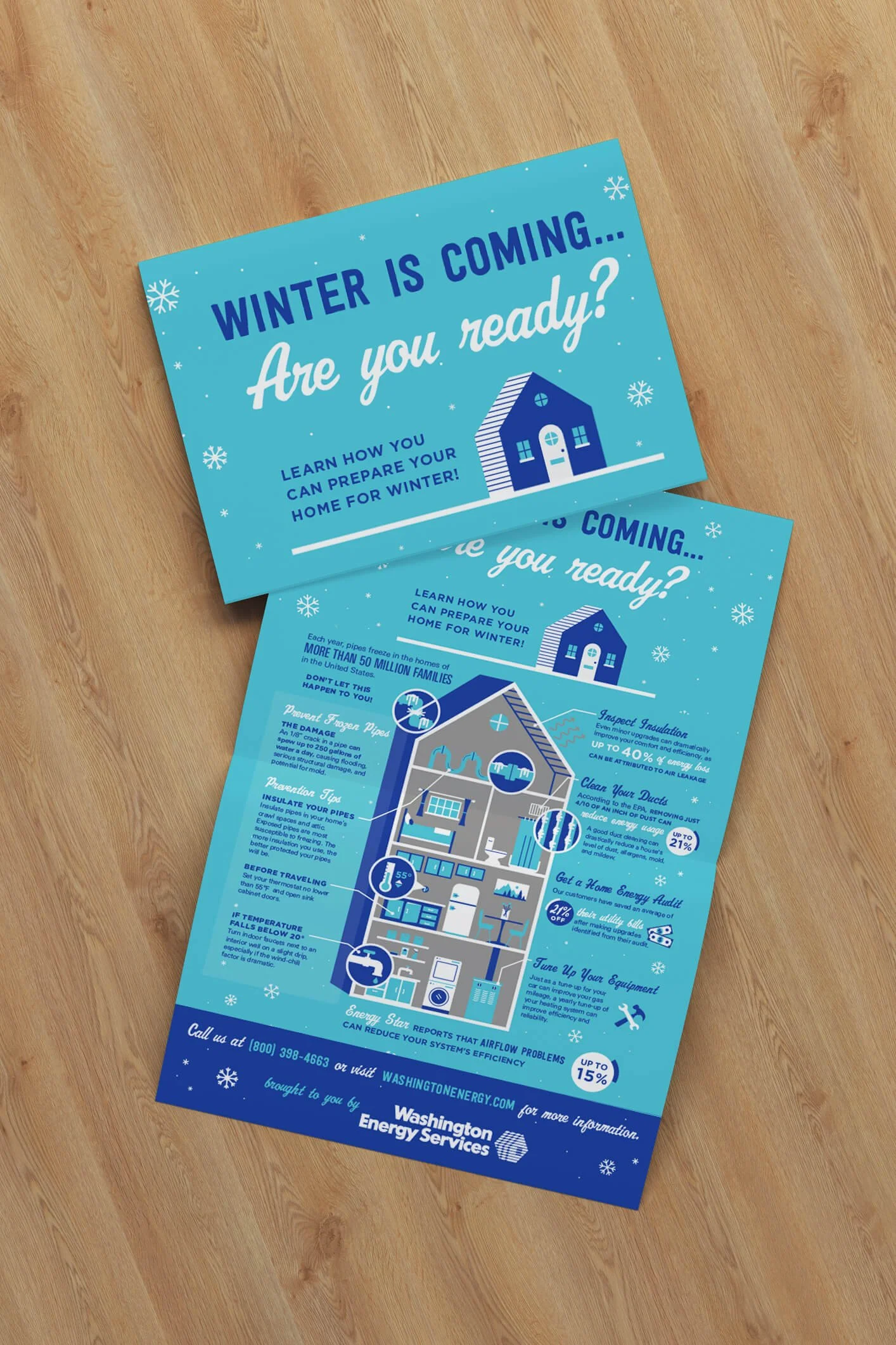 Designed for Washington Energy Services, the piece combines practical advice with energy-saving stats to help homeowners protect their homes during cold weather, building brand loyalty with fun and helpful content.